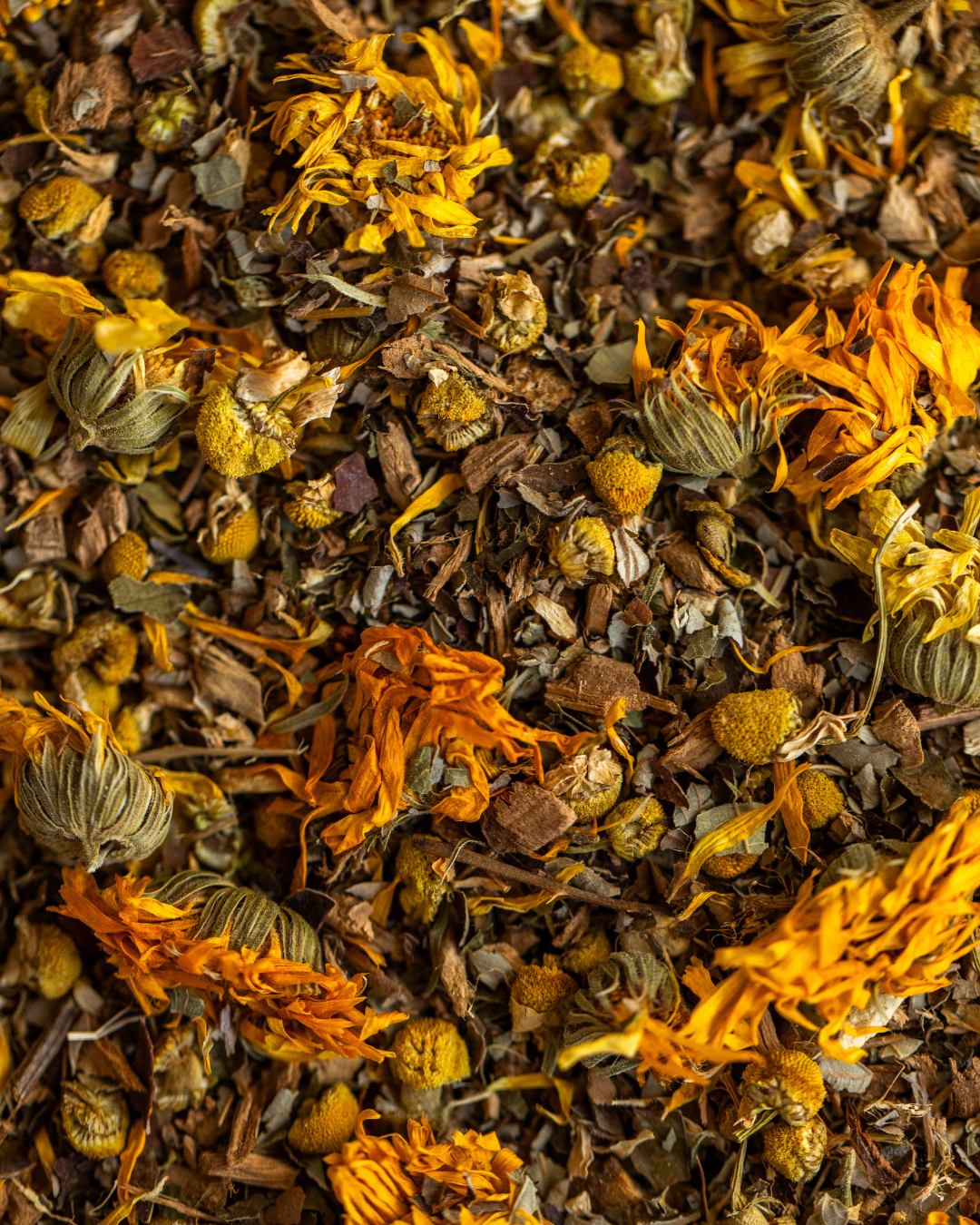 Grass-Fed Beef Bones, Organic Calendula, Organic Chamomile, Organic Marshmallow Root, Organic Blackberry Leaf, Organic Burdock Root, Organic Ginger Root